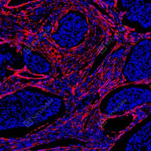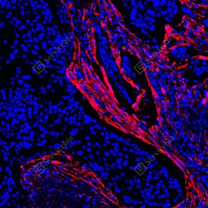 IF检测Caldesmon/CDM蛋白(货号 YB150040)(红色). 样品: 人肺鳞状细胞癌, 4%多聚甲醛 (货号Y1112) 固定12-24小时. 抗原修复: 柠檬酸抗原修复液(干粉, pH 6.0) (Y1212), 高压锅均匀喷气计时2分钟. 封闭: 3% BSA(货号YC305021)的PBS溶液, 室温孵育30分钟. —抗: 1: 4000稀释, 4℃ 孵育过夜. 二抗: Cy3标记山羊抗兔IgG (H+L) (货号YB21314), 1: 300稀释, 室温孵育1小时. |