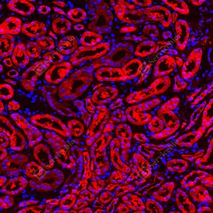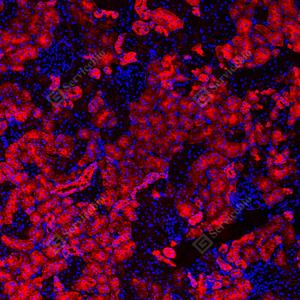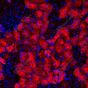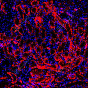 | IF检测Glucose Transporter GLUT2蛋白(货号 YB150179)(红色). 样品: 人肾, 4%多聚甲醛 (货号Y1112) 固定12-24小时. 抗原修复: 抗原修复仪(货号 YRI-4), Tris-EDTA抗原修复液(pH 9.0) (货号Y1214), 水浴100℃, 25分钟. 封闭: 3% BSA(货号YC305021)的PBS溶液, 室温孵育30分钟. —抗: 1: 4000稀释, 4℃ 孵育过夜. 二抗: Cy3标记山羊抗兔IgG (H+L) (货号YB21314), 1: 300稀释, 室温孵育1小时. |