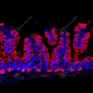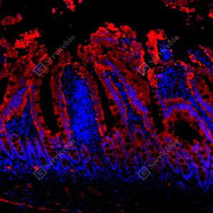 | IF检测Glucose Transporter GLUT2蛋白(货号 YB150179)(红色). 样品: 小鼠小肠, 4%多聚甲醛 (货号Y1112) 固定12-24小时. 抗原修复: 抗原修复仪(货号 YRI-4), Tris-EDTA抗原修复液(pH 9.0) (货号Y1214), 水浴100℃, 25分钟. 封闭: 3% BSA(货号YC305021)的PBS溶液, 室温孵育30分钟. —抗: 1: 4000稀释, 4℃ 孵育过夜. 二抗: Cy3标记山羊抗兔IgG (H+L) (货号YB21314), 1: 300稀释, 室温孵育1小时. |