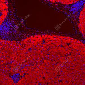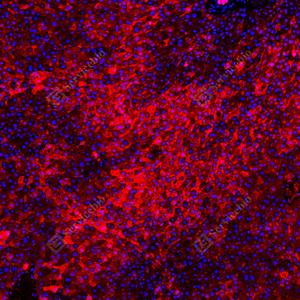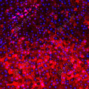 | IF检测Glucose Transporter GLUT2蛋白(货号 YB150179)(红色). 样品: 大鼠肝, 4%多聚甲醛 (货号Y1112) 固定12-24小时. 抗原修复: 抗原修复仪(货号 YRI-4), Tris-EDTA抗原修复液(pH 9.0) (货号Y1214), 水浴100℃, 25分钟. 封闭: 3% BSA(货号YC305021)的PBS溶液, 室温孵育30分钟. —抗: 1: 6000稀释, 4℃ 孵育过夜. 二抗: Cy3标记山羊抗兔IgG (H+L) (货号YB21314), 1: 300稀释, 室温孵育1小时. |