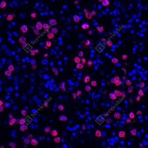 IF检测Sall4蛋白(货号 GB154794)(红色). 样品: 人精原细胞瘤, 4%多聚甲醛 (货号G1101) 固定12-24小时. 抗原修复: 柠檬酸抗原修复液(干粉, pH 6.0) (G1201), 高压锅均匀喷气计时2分钟. 封闭: 3% BSA(货号GC305010)的PBS溶液, 室温孵育30分钟. —抗: 1: 1000稀释, 4℃ 孵育过夜. 二抗: Cy3标记山羊抗小鼠IgG (H+L) (货号GB21301), 1: 300稀释, 室温孵育1小时. |