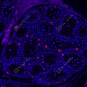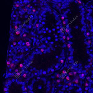 IF检测Sall4蛋白(货号 GB154794)(红色). 样品: 猴睾丸, 4%多聚甲醛 (货号G1101) 固定12-24小时. 抗原修复: 柠檬酸抗原修复液(干粉, pH 6.0) (G1201), 高压锅均匀喷气计时2分钟. 封闭: 3% BSA(货号GC305010)的PBS溶液, 室温孵育30分钟. —抗: 1: 1000稀释, 4℃ 孵育过夜. 二抗: Cy3标记山羊抗小鼠IgG (H+L) (货号GB21301), 1: 300稀释, 室温孵育1小时. |