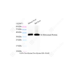 | WB检测S6 Ribosomal Protein蛋白(货号 GB150087). 样品: 经RIPA裂解液(货号G2002)处理的蛋白质. 封闭: 3%脱脂牛奶(货号GC310001)溶于TBST溶液, 室温孵育1小时. —抗: 1: 1000稀释, 4℃ 孵育过夜. 二抗: HRP标记山羊抗小鼠IgG (H+L) (货号GB23301), 1: 5000稀释, 室温孵育1小时. |