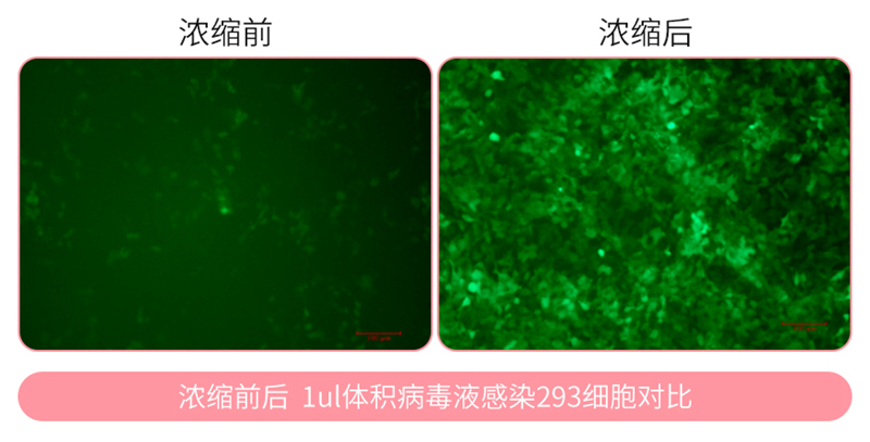 4. 小心去除上清,用原体积1/10~1/100的DMEM或PBS(推荐G4202)重悬慢病毒颗粒(部分情况下,沉淀物不一定肉眼可见),轻轻吹打均匀,重悬沉淀物后,可以测定浓缩慢病毒样品的滴度后根据实验使用量分装并置于-80℃保存(尽量减少慢病毒反复冻融的次数,以免降低病毒滴度)。