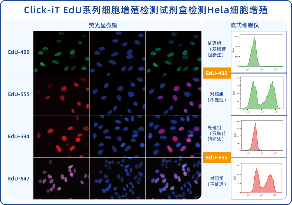 本试剂盒中荧光探针为粉色(远红外)荧光,最大激发波长为656 nm,最大发射波长为670 nm,处于增殖的细胞被标记后,细胞核会显示出明亮的粉色荧光,通过配套常规细胞核染料共同标记细胞核(本试剂盒提供Hoechst 33342细胞核染料),可用荧光显微镜、激光共聚焦显微镜等仪器直接观察细胞增殖情况;也可以使用流式细胞仪检测体外培养细胞群荧光强度,根据荧光强度,来判断细胞周期中S期的DNA复制活性。