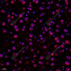 IF检测USP24蛋白(货号 GB112606)(红色). 样品: 小鼠肝, 4%多聚甲醛 (货号G1101) 固定12-24小时. 抗原修复: Tris-EDTA抗原修复液(pH 9.0) (G1203), 98℃, 20分钟. 封闭: 3% BSA(货号GC305010)的PBS溶液, 室温孵育30分钟. —抗: 1: 650稀释, 4℃ 孵育过夜. 二抗: Cy3标记山羊抗兔IgG (H+L) (货号GB21303), 1: 300稀释, 室温孵育1小时. |