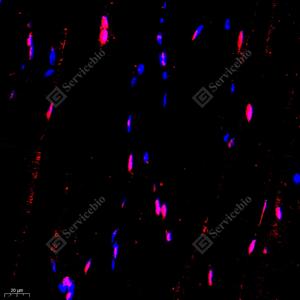 IF检测USP24蛋白(货号 GB112606)(红色). 样品: 小鼠骨骼肌, 4%多聚甲醛 (货号G1101) 固定12-24小时. 抗原修复: Tris-EDTA抗原修复液(pH 9.0) (G1203), 98℃, 20分钟. 封闭: 3% BSA(货号GC305010)的PBS溶液, 室温孵育30分钟. —抗: 1: 650稀释, 4℃ 孵育过夜. 二抗: Cy3标记山羊抗兔IgG (H+L) (货号GB21303), 1: 300稀释, 室温孵育1小时. |