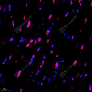IF检测USP24蛋白(货号 GB112606)(红色). 样品: 大鼠心, 4%多聚甲醛 (货号G1101) 固定12-24小时. 抗原修复: Tris-EDTA抗原修复液(pH 9.0) (G1203), 98℃, 20分钟. 封闭: 3% BSA(货号GC305010)的PBS溶液, 室温孵育30分钟. —抗: 1: 650稀释, 4℃ 孵育过夜. 二抗: Cy3标记山羊抗兔IgG (H+L) (货号GB21303), 1: 300稀释, 室温孵育1小时. |