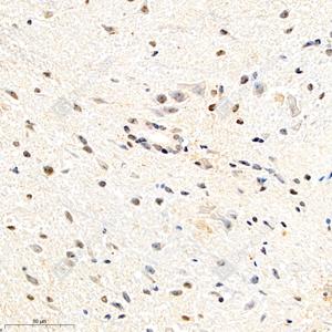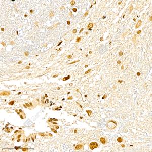 IHC检测USP27X蛋白(货号 GB111100). 样品: 大鼠脊髓, 4%多聚甲醛 (货号G1101) 固定12-24小时. 抗原修复: 柠檬酸抗原修复液(干粉, pH 6.0) (G1201), 98℃, 20分钟. —抗: 1: 700稀释, 4℃ 孵育过夜. 二抗: HRP标记山羊抗兔IgG (H+L) (货号GB23303), 1: 200稀释, 室温孵育1小时. |