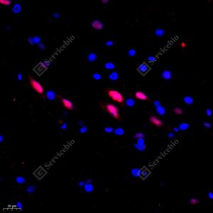 IF检测USP27X蛋白(货号 GB111100)(红色). 样品: 大鼠脊髓, 4%多聚甲醛 (货号G1101) 固定12-24小时. 抗原修复: Tris-EDTA抗原修复液(pH 9.0) (G1203), 98℃, 20分钟. 封闭: 3% BSA(货号GC305010)的PBS溶液, 室温孵育30分钟. —抗: 1: 1500稀释, 4℃ 孵育过夜. 二抗: Cy3标记山羊抗兔IgG (H+L) (货号GB21303), 1: 300稀释, 室温孵育1小时. |