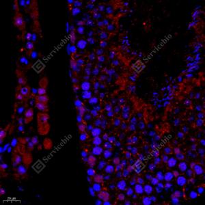 IF检测USP27X蛋白(货号 GB111100)(红色). 样品: 大鼠睾丸, 4%多聚甲醛 (货号G1101) 固定12-24小时. 抗原修复: Tris-EDTA抗原修复液(pH 9.0) (G1203), 98℃, 20分钟. 封闭: 3% BSA(货号GC305010)的PBS溶液, 室温孵育30分钟. —抗: 1: 1500稀释, 4℃ 孵育过夜. 二抗: Cy3标记山羊抗兔IgG (H+L) (货号GB21303), 1: 300稀释, 室温孵育1小时. |