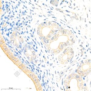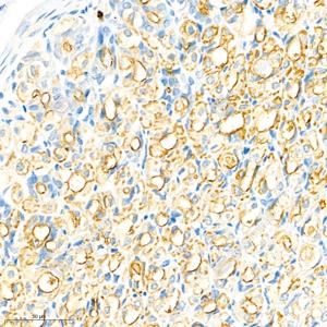 IHC检测Mast Cell Chymase蛋白(货号 GB111085). 样品: 大鼠子宫, 4%多聚甲醛 (货号G1101) 固定12-24小时. 抗原修复: 柠檬酸抗原修复液(干粉, pH 6.0) (G1201), 98℃, 20分钟. —抗: 1: 2000稀释, 4℃ 孵育过夜. 二抗: HRP标记山羊抗兔IgG (H+L) (货号GB23303), 1: 200稀释, 室温孵育1小时. |