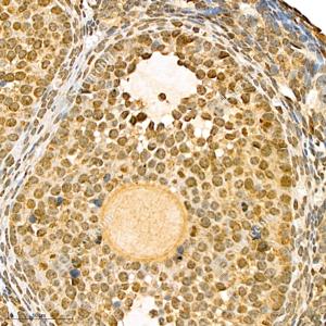 IHC检测Clusterin蛋白(货号 GB111144). 样品: 小鼠卵巢, 4%多聚甲醛 (货号G1101) 固定12-24小时. 抗原修复: 柠檬酸抗原修复液(干粉, pH 6.0) (G1201), 98℃, 20分钟. —抗: 1: 900稀释, 4℃ 孵育过夜. 二抗: HRP标记山羊抗兔IgG (H+L) (货号GB23303), 1: 200稀释, 室温孵育1小时. |