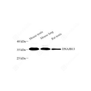 WB检测DNAJB13蛋白(货号 GB115377). 样品: 经RIPA裂解液(货号G2002)处理的蛋白质. 封闭: 封闭: 3%脱脂牛奶(货号GC310001)溶于TBST溶液, 室温孵育1小时. —抗: 1: 2000稀释, 4℃ 孵育过夜. 二抗: HRP标记山羊抗兔IgG (H+L) (货号GB23303), 1: 5000稀释, 室温孵育1小时. |