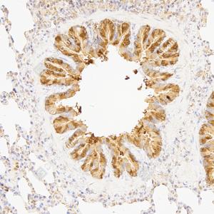 IHC检测DNAJA4蛋白(货号 GB115298). 样品: 小鼠肺, 4%多聚甲醛 (货号G1101) 固定12-24小时. 抗原修复: Tris-EDTA抗原修复液(pH 9.0) (G1203), 98℃, 20分钟. —抗: 1: 700稀释, 4℃ 孵育过夜. 二抗: HRP标记山羊抗兔IgG (H+L) (货号GB23303), 1: 200稀释, 室温孵育1小时. |