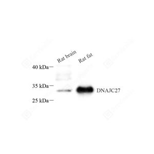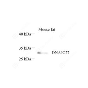 WB检测DNAJC27蛋白(货号 GB115041). 样品: 经RIPA裂解液(货号G2002)处理的蛋白质. 封闭: 封闭: 3%脱脂牛奶(货号GC310001)溶于TBST溶液, 室温孵育1小时. —抗: 1: 1000稀释, 4℃ 孵育过夜. 二抗: HRP标记山羊抗兔IgG (H+L) (货号GB23303), 1: 5000稀释, 室温孵育1小时. |