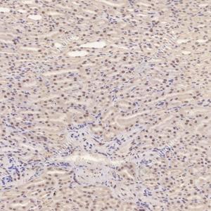 IHC检测PFDN4蛋白(货号 GB112797). 样品: 小鼠肾, 4%多聚甲醛 (货号G1101) 固定12-24小时. 抗原修复: 柠檬酸抗原修复液(干粉, pH 6.0) (G1201), 98℃, 20分钟. —抗: 1: 4200稀释, 4℃ 孵育过夜. 二抗: HRP标记山羊抗兔IgG (H+L) (货号GB23303), 1: 200稀释, 室温孵育1小时. |