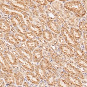 IHC检测PFDN2蛋白(货号 GB114983). 样品: 小鼠肾, 4%多聚甲醛 (货号G1101) 固定12-24小时. 抗原修复: Tris-EDTA抗原修复液(pH 9.0) (G1203), 98℃, 20分钟. —抗: 1: 600稀释, 4℃ 孵育过夜. 二抗: HRP标记山羊抗兔IgG (H+L) (货号GB23303), 1: 200稀释, 室温孵育1小时. |