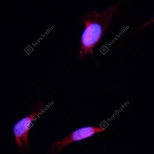 ICC检测PFDN2蛋白(货号 GB114983)(红色). 样品: Hela细胞, 4%多聚甲醛 (货号G1101) 固定20分钟. 封闭: 3% BSA(货号GC305010)的PBS溶液, 室温孵育30分钟. —抗: 1: 100稀释, 4℃ 孵育过夜. 二抗: Cy3标记山羊抗兔IgG (H+L) (货号GB21303), 1: 300稀释, 室温孵育1小时. |
