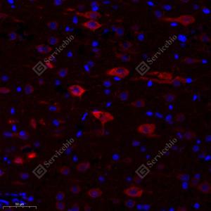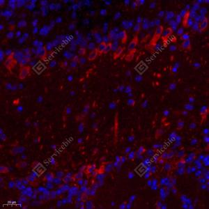 IF检测TTC33蛋白(货号 GB112360)(红色). 样品: 小鼠前额叶, 4%多聚甲醛 (货号G1101) 固定12-24小时. 抗原修复: Tris-EDTA抗原修复液(pH 9.0) (G1203), 98℃, 20分钟. 封闭: 3% BSA(货号GC305010)的PBS溶液, 室温孵育30分钟. —抗: 1: 650稀释, 4℃ 孵育过夜. 二抗: Cy3标记山羊抗兔IgG (H+L) (货号GB21303), 1: 300稀释, 室温孵育1小时. |