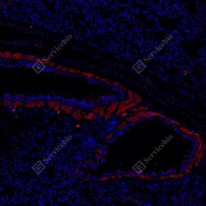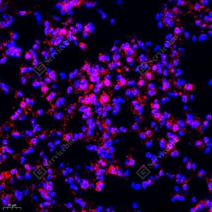 IF检测Calponin 1蛋白(货号 GB112540)(红色). 样品: 小鼠肺, 4%多聚甲醛 (货号G1101) 固定12-24小时. 抗原修复: Tris-EDTA抗原修复液(pH 9.0) (G1203), 98℃, 20分钟. 封闭: 3% BSA(货号GC305010)的PBS溶液, 室温孵育30分钟. —抗: 1: 650稀释, 4℃ 孵育过夜. 二抗: Cy3标记山羊抗兔IgG (H+L) (货号GB21303), 1: 300稀释, 室温孵育1小时. |