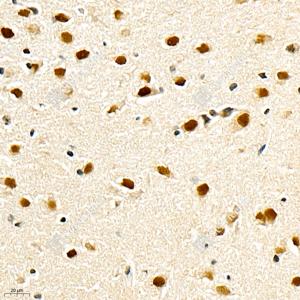 IHC检测MEF2C蛋白(货号 GB11692). 样品: 小鼠脑, 4%多聚甲醛 (货号G1101) 固定12-24小时. 抗原修复: 柠檬酸抗原修复液(干粉, pH 6.0) (G1201), 98℃, 20分钟. —抗: 1: 1000稀释, 4℃ 孵育过夜. 二抗: HRP标记山羊抗兔IgG (H+L) (货号GB23303), 1: 200稀释, 室温孵育1小时. |