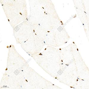 IHC检测MEF2C蛋白(货号 GB11692). 样品: 大鼠骨骼肌, 4%多聚甲醛 (货号G1101) 固定12-24小时. 抗原修复: 柠檬酸抗原修复液(干粉, pH 6.0) (G1201), 98℃, 20分钟. —抗: 1: 1000稀释, 4℃ 孵育过夜. 二抗: HRP标记山羊抗兔IgG (H+L) (货号GB23303), 1: 200稀释, 室温孵育1小时. |