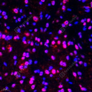IF检测MEF2C蛋白(货号 GB11692)(红色). 样品: 大鼠脑, 4%多聚甲醛 (货号G1101) 固定12-24小时. 抗原修复: Tris-EDTA抗原修复液(pH 9.0) (G1203), 98℃, 20分钟. 封闭: 3% BSA(货号GC305010)的PBS溶液, 室温孵育30分钟. —抗: 1: 1000稀释, 4℃ 孵育过夜. 二抗: Cy3标记山羊抗兔IgG (H+L) (货号GB21303), 1: 300稀释, 室温孵育1小时. |