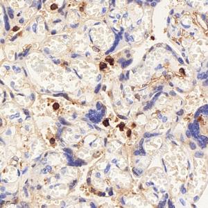 IHC检测S100 alpha 6/PRA蛋白(货号 GB113362). 样品: 人胎盘, 4%多聚甲醛 (货号G1101) 固定12-24小时. 抗原修复: 柠檬酸抗原修复液(干粉, pH 6.0) (G1201), 98℃, 20分钟. —抗: 1: 1600稀释, 4℃ 孵育过夜. 二抗: HRP标记山羊抗兔IgG (H+L) (货号GB23303), 1: 200稀释, 室温孵育1小时. |