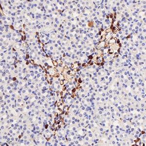 IHC检测S100 alpha 6/PRA蛋白(货号 GB113362). 样品: 大鼠睾丸, 4%多聚甲醛 (货号G1101) 固定12-24小时. 抗原修复: 柠檬酸抗原修复液(干粉, pH 6.0) (G1201), 98℃, 20分钟. —抗: 1: 1600稀释, 4℃ 孵育过夜. 二抗: HRP标记山羊抗兔IgG (H+L) (货号GB23303), 1: 200稀释, 室温孵育1小时. |