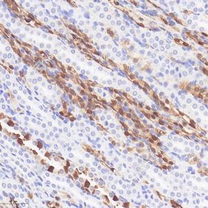 IHC检测S100 alpha 6/PRA蛋白(货号 GB113362). 样品: 小鼠肾, 4%多聚甲醛 (货号G1101) 固定12-24小时. 抗原修复: 柠檬酸抗原修复液(干粉, pH 6.0) (G1201), 98℃, 20分钟. —抗: 1: 1600稀释, 4℃ 孵育过夜. 二抗: HRP标记山羊抗兔IgG (H+L) (货号GB23303), 1: 200稀释, 室温孵育1小时. |
