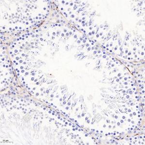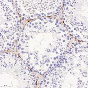 IHC检测S100 alpha 6/PRA蛋白(货号 GB113362). 样品: 小鼠睾丸, 4%多聚甲醛 (货号G1101) 固定12-24小时. 抗原修复: 柠檬酸抗原修复液(干粉, pH 6.0) (G1201), 98℃, 20分钟. —抗: 1: 1600稀释, 4℃ 孵育过夜. 二抗: HRP标记山羊抗兔IgG (H+L) (货号GB23303), 1: 200稀释, 室温孵育1小时. |