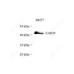 WB检测CAB39/MO25蛋白(货号 GB115360). 样品: 经RIPA裂解液(货号G2002)处理的蛋白质. 封闭: 封闭: 3%脱脂牛奶(货号GC310001)溶于TBST溶液, 室温孵育1小时. —抗: 1: 1000稀释, 4℃ 孵育过夜. 二抗: HRP标记山羊抗兔IgG (H+L) (货号GB23303), 1: 5000稀释, 室温孵育1小时. |