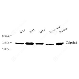 WB检测Calpain 1蛋白(货号 GB111942). 样品: 经RIPA裂解液(货号G2002)处理的蛋白质. 封闭: 封闭: 3%脱脂牛奶(货号GC310001)溶于TBST溶液, 室温孵育1小时. —抗: 1: 500稀释, 4℃ 孵育过夜. 二抗: HRP标记山羊抗兔IgG (H+L) (货号GB23303), 1: 5000稀释, 室温孵育1小时. |