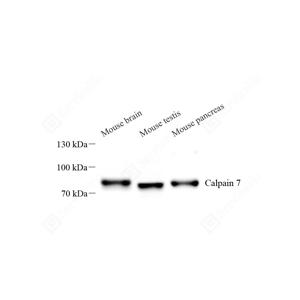 WB检测Calpain 7蛋白(货号 GB115291). 样品: 经RIPA裂解液(货号G2002)处理的蛋白质. 封闭: 封闭: 3%脱脂牛奶(货号GC310001)溶于TBST溶液, 室温孵育1小时. —抗: 1: 1000稀释, 4℃ 孵育过夜. 二抗: HRP标记山羊抗兔IgG (H+L) (货号GB23303), 1: 5000稀释, 室温孵育1小时. |