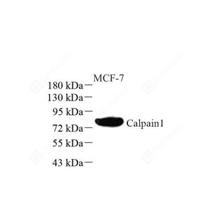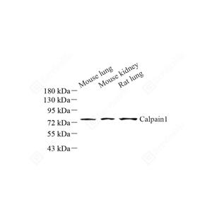 WB检测Calpain 2蛋白(货号 GB11552). 样品: 经RIPA裂解液(货号G2002)处理的蛋白质. 封闭: 封闭: 3%脱脂牛奶(货号GC310001)溶于TBST溶液, 室温孵育1小时. —抗: 1: 400稀释, 4℃ 孵育过夜. 二抗: HRP标记山羊抗兔IgG (H+L) (货号GB23303), 1: 5000稀释, 室温孵育1小时. |