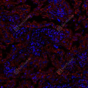 | IF检测DSPP蛋白(货号 GB112965)(红色). 样品: 人肺癌, 4%多聚甲醛 (货号G1101) 固定12-24小时. 抗原修复: Tris-EDTA抗原修复液(pH 9.0) (G1203), 98℃, 20分钟. 封闭: 3% BSA(货号GC305010)的PBS溶液, 室温孵育30分钟. —抗: 1: 500稀释, 4℃ 孵育过夜. 二抗: Cy3标记山羊抗兔IgG (H+L) (货号GB21303), 1: 300稀释, 室温孵育1小时. |