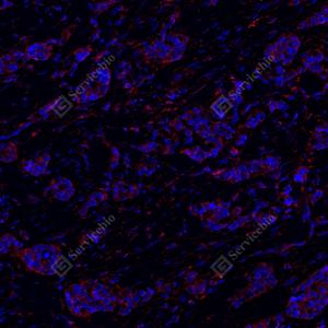 | IF检测DSPP蛋白(货号 GB112965)(红色). 样品: 人乳腺癌, 4%多聚甲醛 (货号G1101) 固定12-24小时. 抗原修复: Tris-EDTA抗原修复液(pH 9.0) (G1203), 98℃, 20分钟. 封闭: 3% BSA(货号GC305010)的PBS溶液, 室温孵育30分钟. —抗: 1: 500稀释, 4℃ 孵育过夜. 二抗: Cy3标记山羊抗兔IgG (H+L) (货号GB21303), 1: 300稀释, 室温孵育1小时. |