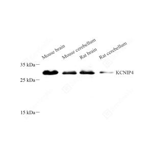 WB检测KCNIP4蛋白(货号 GB114112). 样品: 经RIPA裂解液(货号G2002)处理的蛋白质. 封闭: 3%脱脂牛奶(货号GC310001)溶于TBST溶液, 室温孵育1小时. —抗: 1: 1400稀释, 4℃ 孵育过夜. 二抗: HRP标记山羊抗兔IgG (H+L) (货号GB23303), 1: 5000稀释, 室温孵育1小时. |