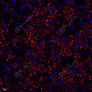 IF检测KCNIP4蛋白(货号 GB114112)(红色). 样品: 小鼠脑, 4%多聚甲醛 (货号G1101) 固定12-24小时. 抗原修复: Tris-EDTA抗原修复液(pH 9.0) (G1203), 98℃, 20分钟. 封闭: 3% BSA(货号GC305010)的PBS溶液, 室温孵育30分钟. —抗: 1: 800稀释, 4℃ 孵育过夜. 二抗: Cy3标记山羊抗兔IgG (H+L) (货号GB21303), 1: 300稀释, 室温孵育1小时. |