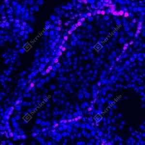 | IF检测Scramblase 1蛋白(货号 GB113827)(红色). 样品: 小鼠睾丸, 4%多聚甲醛 (货号G1101) 固定12-24小时. 抗原修复: Tris-EDTA抗原修复液(pH 9.0) (G1203), 98℃, 20分钟. 封闭: 3% BSA(货号GC305010)的PBS溶液, 室温孵育30分钟. —抗: 1: 500稀释, 4℃ 孵育过夜. 二抗: Cy3标记山羊抗兔IgG (H+L) (货号GB21303), 1: 300稀释, 室温孵育1小时. |