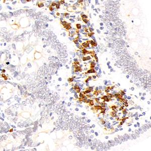 IHC检测Stanniocalcin 1/STC蛋白(货号 GB113770). 样品: 小鼠十二指肠, 4%多聚甲醛 (货号G1101) 固定12-24小时. 抗原修复: 柠檬酸抗原修复液(干粉, pH 6.0) (G1201), 98℃, 20分钟. —抗: 1: 400稀释, 4℃ 孵育过夜. 二抗: HRP标记山羊抗兔IgG (H+L) (货号GB23303), 1: 200稀释, 室温孵育1小时. |
