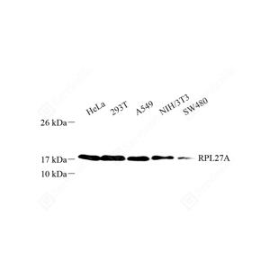 WB检测RPL27A蛋白(货号 GB111782). 样品: 经RIPA裂解液(货号G2002)处理的蛋白质. 封闭: 3%脱脂牛奶(货号GC310001)溶于TBST溶液, 室温孵育1小时. —抗: 1: 500稀释, 4℃ 孵育过夜. 二抗: HRP标记山羊抗兔IgG (H+L) (货号GB23303), 1: 5000稀释, 室温孵育1小时. |