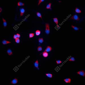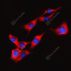 ICC检测RPL27A蛋白(货号 GB111782)(红色). 样品: NIH-3T3细胞, 4%多聚甲醛 (货号G1101) 固定20分钟. 封闭: 3% BSA(货号GC305010)的PBS溶液, 室温孵育30分钟. 一抗: 1: 100稀释, 4℃ 孵育过夜. 二抗: Cy3标记山羊抗兔IgG (H+L) (货号GB21303), 1: 300稀释, 室温孵育1小时. |
