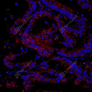 IF检测RPLP1蛋白(货号 GB114437)(红色). 样品: 人结肠癌, 4%多聚甲醛 (货号G1101) 固定12-24小时. 抗原修复: Tris-EDTA抗原修复液(pH 9.0) (G1203), 98℃, 20分钟. 封闭: 3% BSA(货号GC305010)的PBS溶液, 室温孵育30分钟. —抗: 1: 700稀释, 4℃ 孵育过夜. 二抗: Cy3标记山羊抗兔IgG (H+L) (货号GB21303), 1: 300稀释, 室温孵育1小时. |