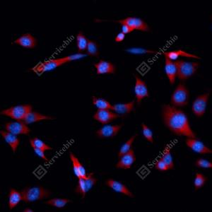 ICC检测RPLP1蛋白(货号 GB114437)(红色). 样品: NIH-3T3细胞, 4%多聚甲醛 (货号G1101) 固定20分钟. 封闭: 3% BSA(货号GC305010)的PBS溶液, 室温孵育30分钟. 一抗: 1: 100稀释, 4℃ 孵育过夜. 二抗: Cy3标记山羊抗兔IgG (H+L) (货号GB21303), 1: 300稀释, 室温孵育1小时. |