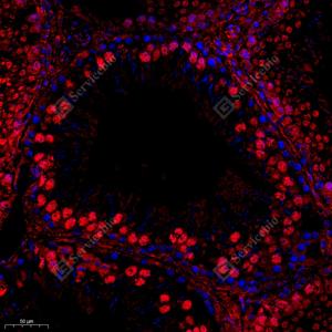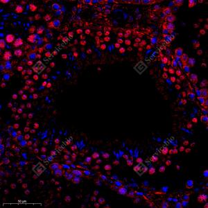 IF检测Rpl10l蛋白(货号 GB112185)(红色). 样品: 小鼠睾丸, 4%多聚甲醛 (货号G1101) 固定12-24小时. 抗原修复: Tris-EDTA抗原修复液(pH 9.0) (G1203), 98℃, 20分钟. 封闭: 3% BSA(货号GC305010)的PBS溶液, 室温孵育30分钟. —抗: 1: 650稀释, 4℃ 孵育过夜. 二抗: Cy3标记山羊抗兔IgG (H+L) (货号GB21303), 1: 300稀释, 室温孵育1小时. |