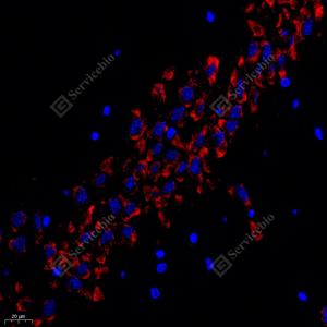 IF检测Rpl10l蛋白(货号 GB112185)(红色). 样品: 大鼠海马区, 4%多聚甲醛 (货号G1101) 固定12-24小时. 抗原修复: Tris-EDTA抗原修复液(pH 9.0) (G1203), 98℃, 20分钟. 封闭: 3% BSA(货号GC305010)的PBS溶液, 室温孵育30分钟. —抗: 1: 400稀释, 4℃ 孵育过夜. 二抗: Cy3标记山羊抗兔IgG (H+L) (货号GB21303), 1: 300稀释, 室温孵育1小时. |