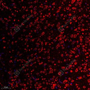 IF检测Rpl10l蛋白(货号 GB112185)(红色). 样品: 小鼠黑质, 4%多聚甲醛 (货号G1101) 固定12-24小时. 抗原修复: Tris-EDTA抗原修复液(pH 9.0) (G1203), 98℃, 20分钟. 封闭: 3% BSA(货号GC305010)的PBS溶液, 室温孵育30分钟. —抗: 1: 650稀释, 4℃ 孵育过夜. 二抗: Cy3标记山羊抗兔IgG (H+L) (货号GB21303), 1: 300稀释, 室温孵育1小时. |