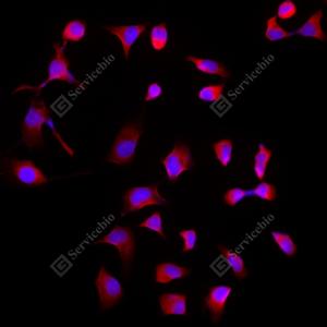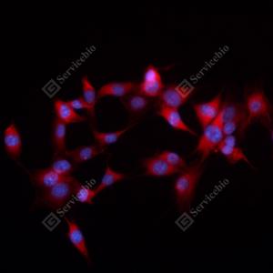 ICC检测Rpl10l蛋白(货号 GB112185)(红色). 样品: NIH-3T3细胞, 4%多聚甲醛 (货号G1101) 固定20分钟. 封闭: 3% BSA(货号GC305010)的PBS溶液, 室温孵育30分钟. 一抗: 1: 100稀释, 4℃ 孵育过夜. 二抗: Cy3标记山羊抗兔IgG (H+L) (货号GB21303), 1: 300稀释, 室温孵育1小时. |